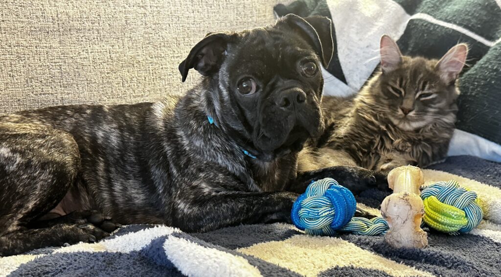 My brother Toby and I are 6-month-old neutered pug(ish) pups looking for our forever families. We promise to fill your home with snuggles, silliness, and so much love.