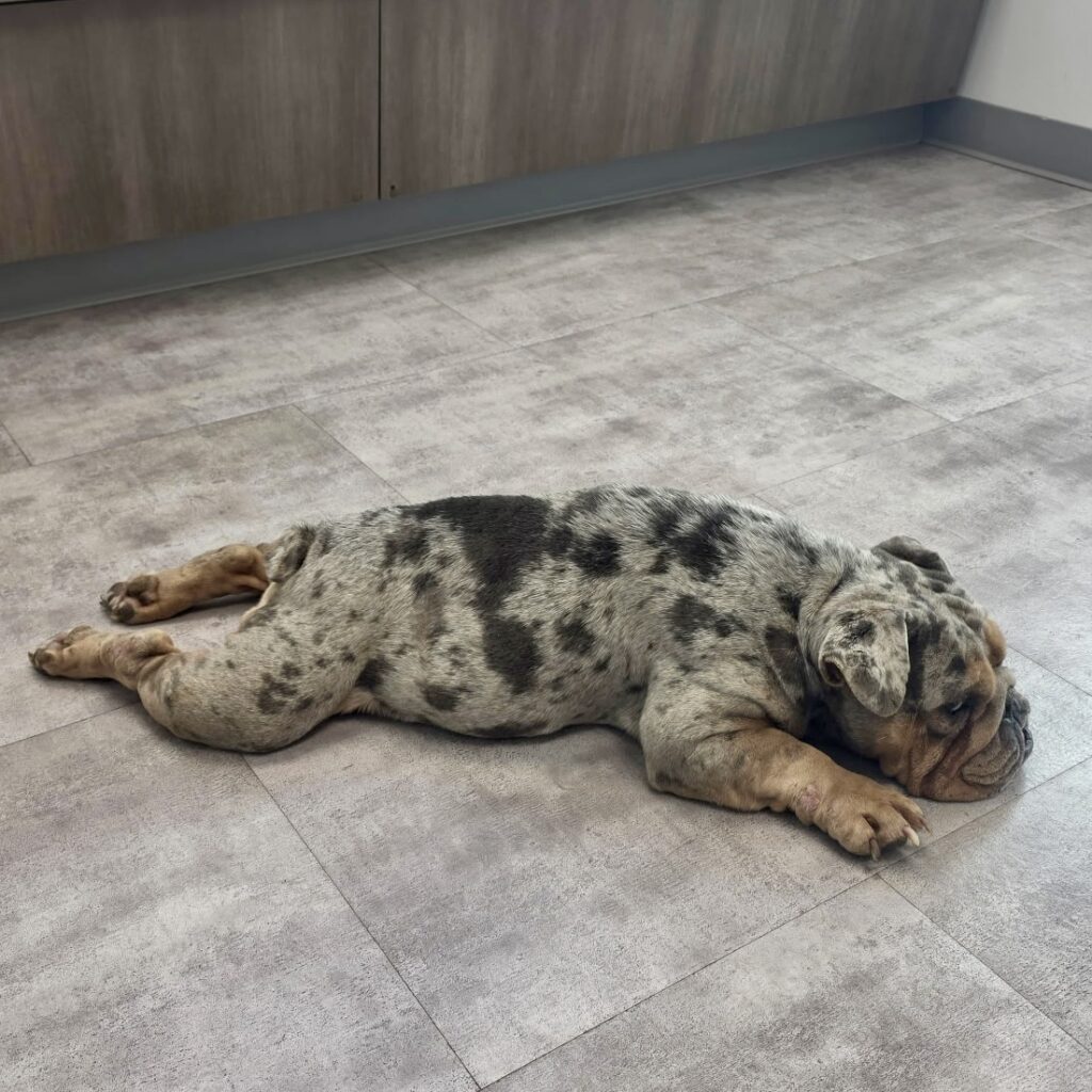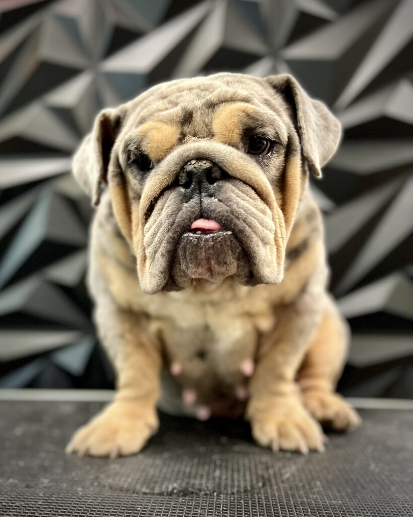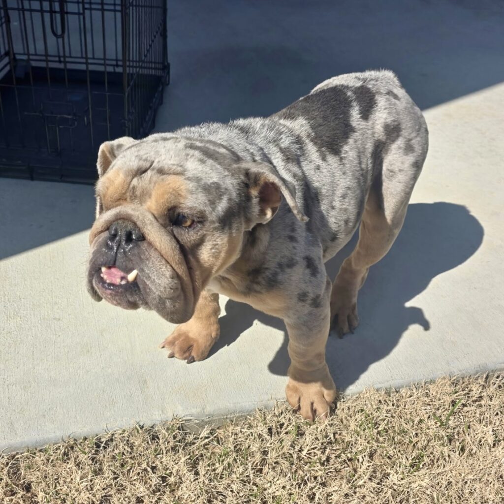 Meet Chicky, our darling 5-year-old English Bulldog rescued from a breeding program and ready to start fresh. With that squishy face, signature underbite, and solid “certified couch nugget” body type, she is serving up major low-rider vibes.