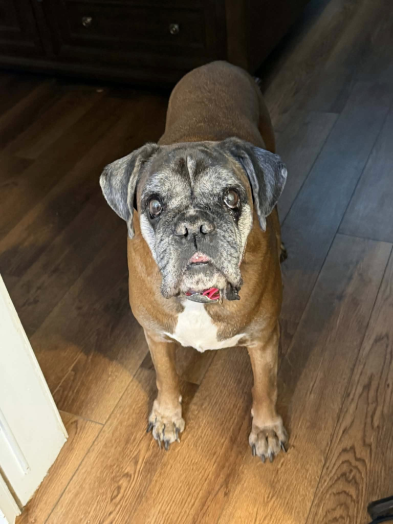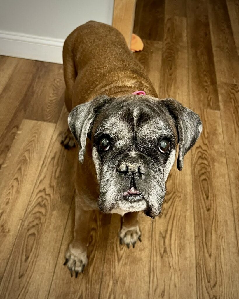 This stunning sugar-faced senior is new to CH Boxer Rescue, and her story tugs at the heart. Estelle was imported from Ukraine as a puppy and spent the last 8 years being used for breeding. Now that her “job” is over, we need to find Estelle a dream retirement home.