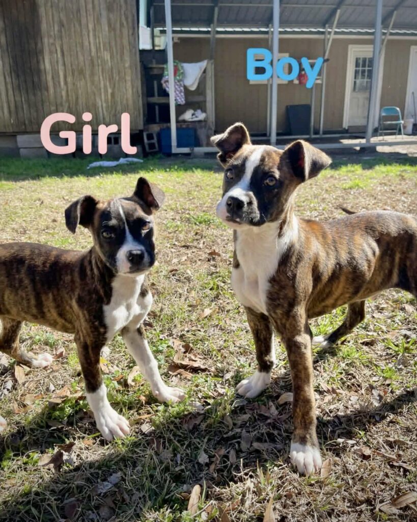 These two adorable 4-month-old Boxer mix puppies — one male and one female — are almost ready to find their forever homes!