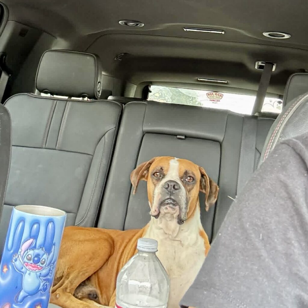 This 4-ish year old fawn boxer wandered onto someone’s property and didn’t leave for several days. He stuck close to a kind human who fed him and provided water until we could scoop him up. And the second he got in the car? Instant exhale. Curled up, settled in, and rode off like he knew his life was finally turning around.